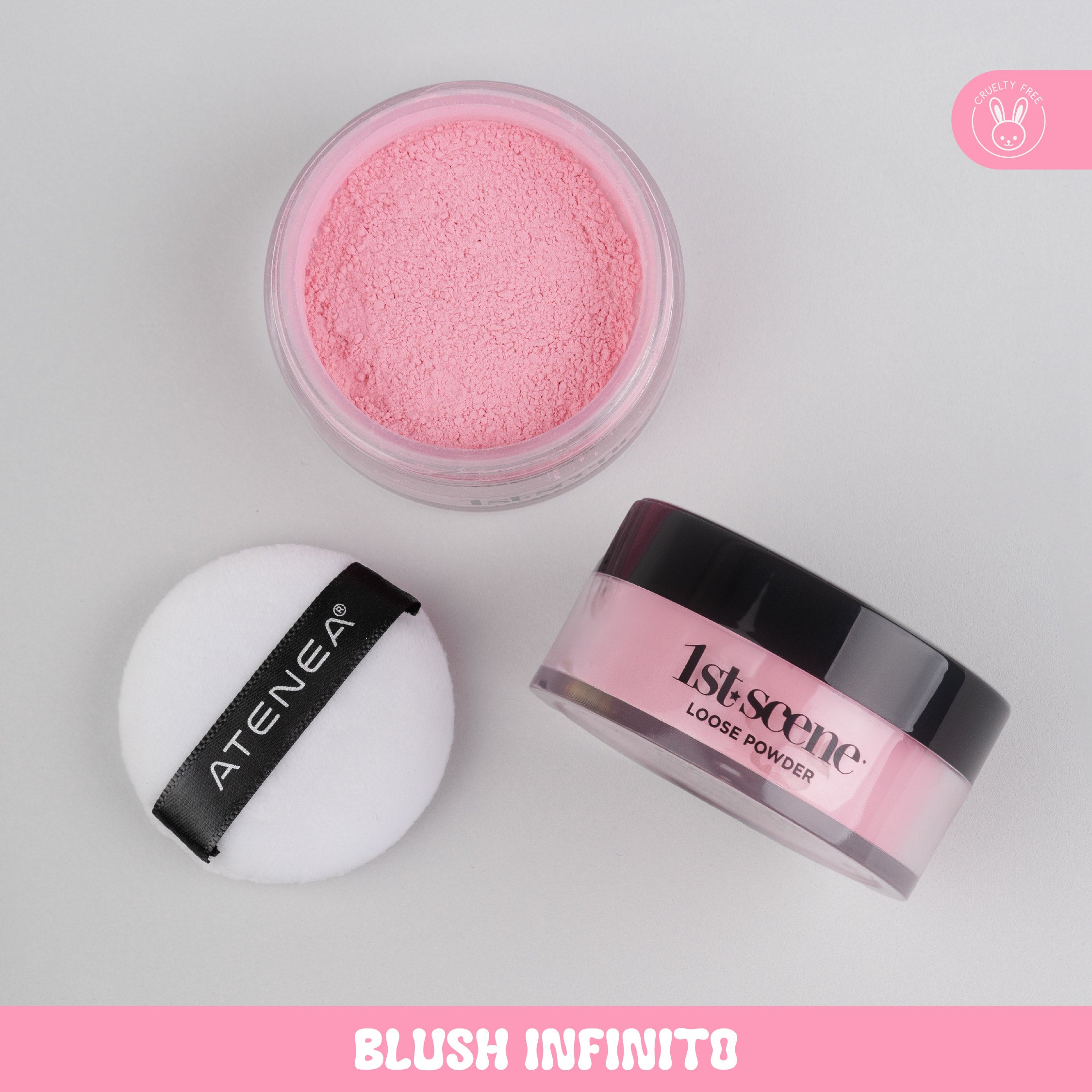 ¡Un toque de blush infinito! El nuevo polvo suelto rosado de 1St. Scene ha sido creado para sellar la zona de la ojera y conectarla con el rubor para crear un efecto de blush infinito, brindando un toque de color rosado para realzar la luminosidad de la piel.