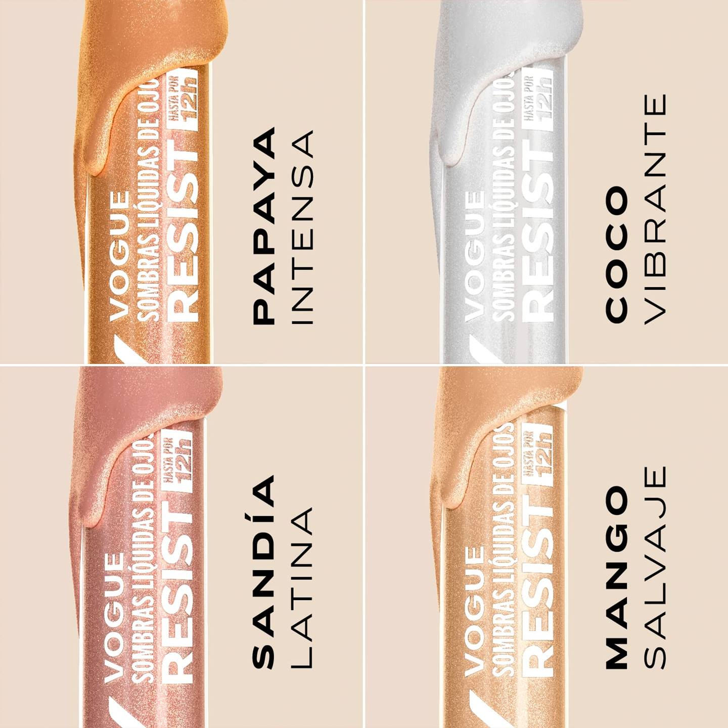 Deslumbra con las nuevas sombras líquidas Resist de Vogue. Su fórmula innovadora te ofrece un color metálico intenso que se mantiene vibrante hasta por 12 horas. Resistentes al agua y no transfieren, estas sombras te brindan una mirada impecable durante todo el día.
